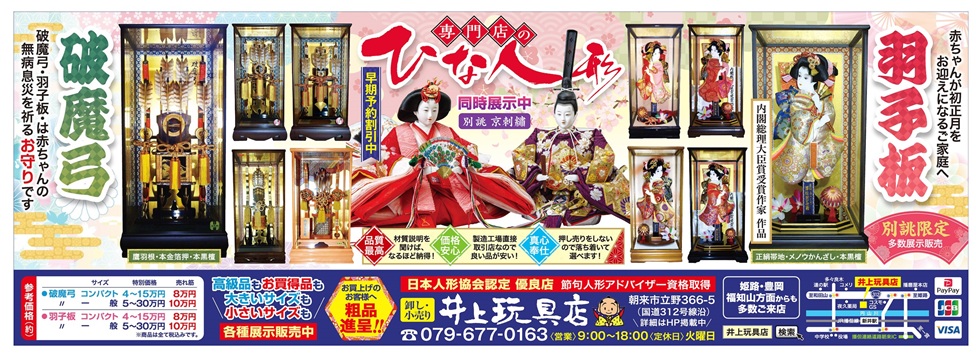 破魔弓・羽子板は大きい物から小さいものまで、高級商品からお買い得商品まで各種展示しています。販売価格は約30%割引以上の特別価格・税込み表示にて店舗販売しています。製造工場直接取引商品はさらに品物を良くしています。だから同じ予算でさらに2ランク上がお買い求めます。遠方からのお客さんに感動した、良かった、やっぱし品物が違う来たかいあるわと喜んでお買い求めいただきました。地元の皆様はもとより遠方のお客様も大変多いい店ですよ。皆様のご注文、ご来店心よりお待ち申し上げます。